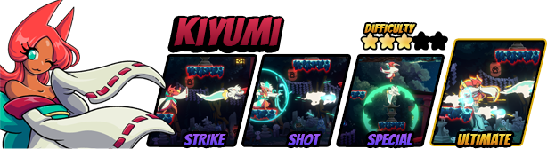 An interchange student from a faraway land, Kiyumi is a gentle half-fox spirit wrangler who commands the not-so-gentle spirit, Kitsuro, who probably wants you dead. You control Kiyumi directly, while you command Kitsuro with her Strike to go after distant bullets.