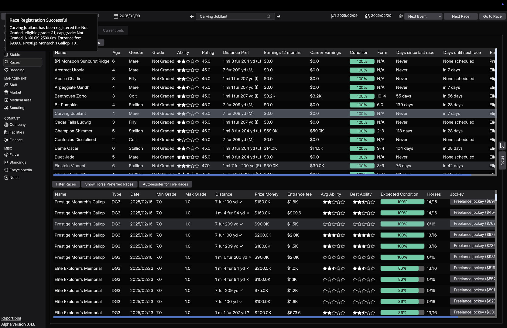 Hire and manage jockeys, trainers, veterinarians and support staff. Staff skills influence horse development, race performance, and overall stable efficiency.