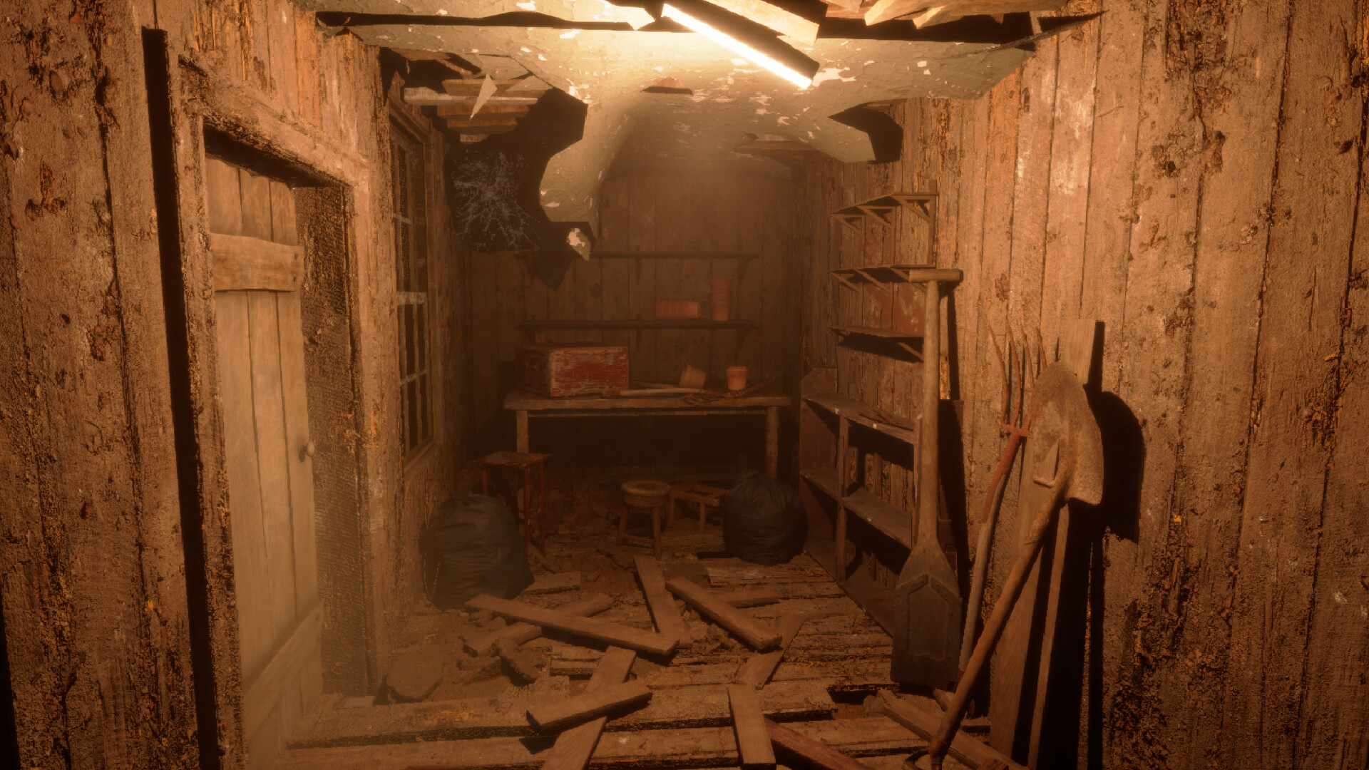 At the house, there is a garage. In the garage, there is an old car. If you manage to start it and open the garage door you can escape that way. Repair and unlock the hidden vehicle to flee the nightmare.
