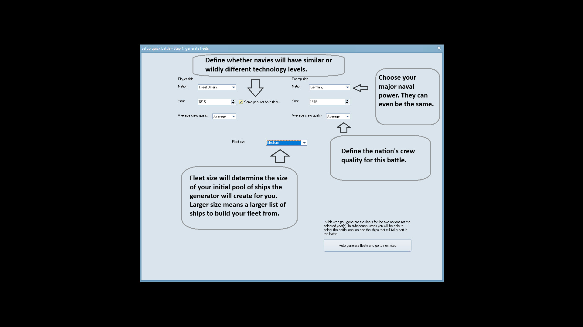 Varied Technology and Year Parameters: Set the fleets to be of a similar technological level for a balanced skirmish or create hypothetical scenarios with wide gaps in naval technology.