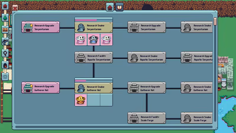 Each one of the buildings can house different types of snakes and each one sheds a different scale. Their scales can be used to construct new buildings, craft better tools and equipment or be sold for gold. From horned snakes, to ones with wheels and even wings, there will be plenty of slithering friends to make.