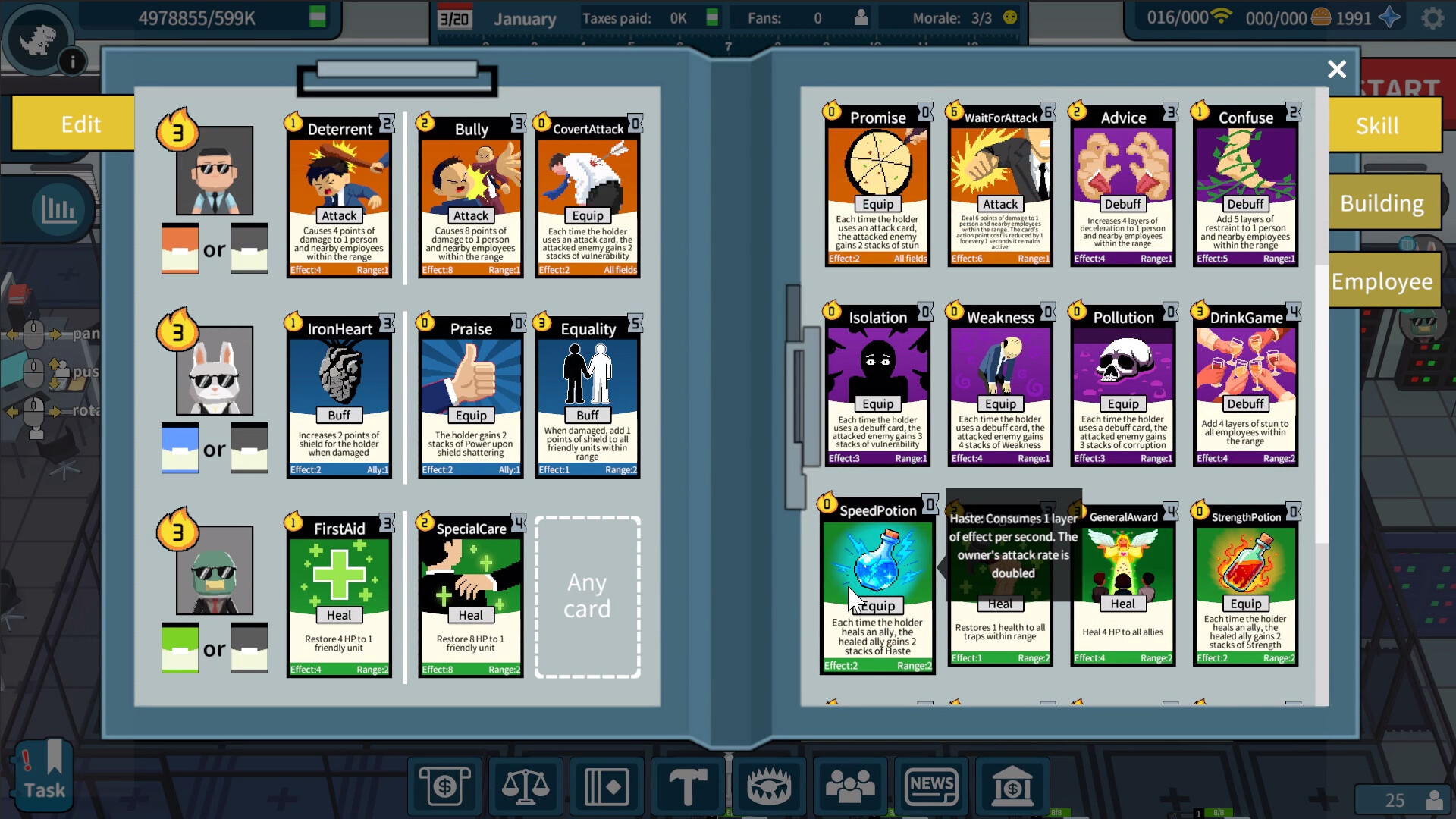 During the preparation phase, you can use construction cards to expand the site and build facilities. They can also use hiring cards to hire employees based on project needs. Facilities are divided into R&D, food, and server rooms. You must allocate talent to each department to keep the company running.You can assign skill cards to their bosses and management employees. Cards are divided into construction cards, hiring cards, trap cards, and skill cards.