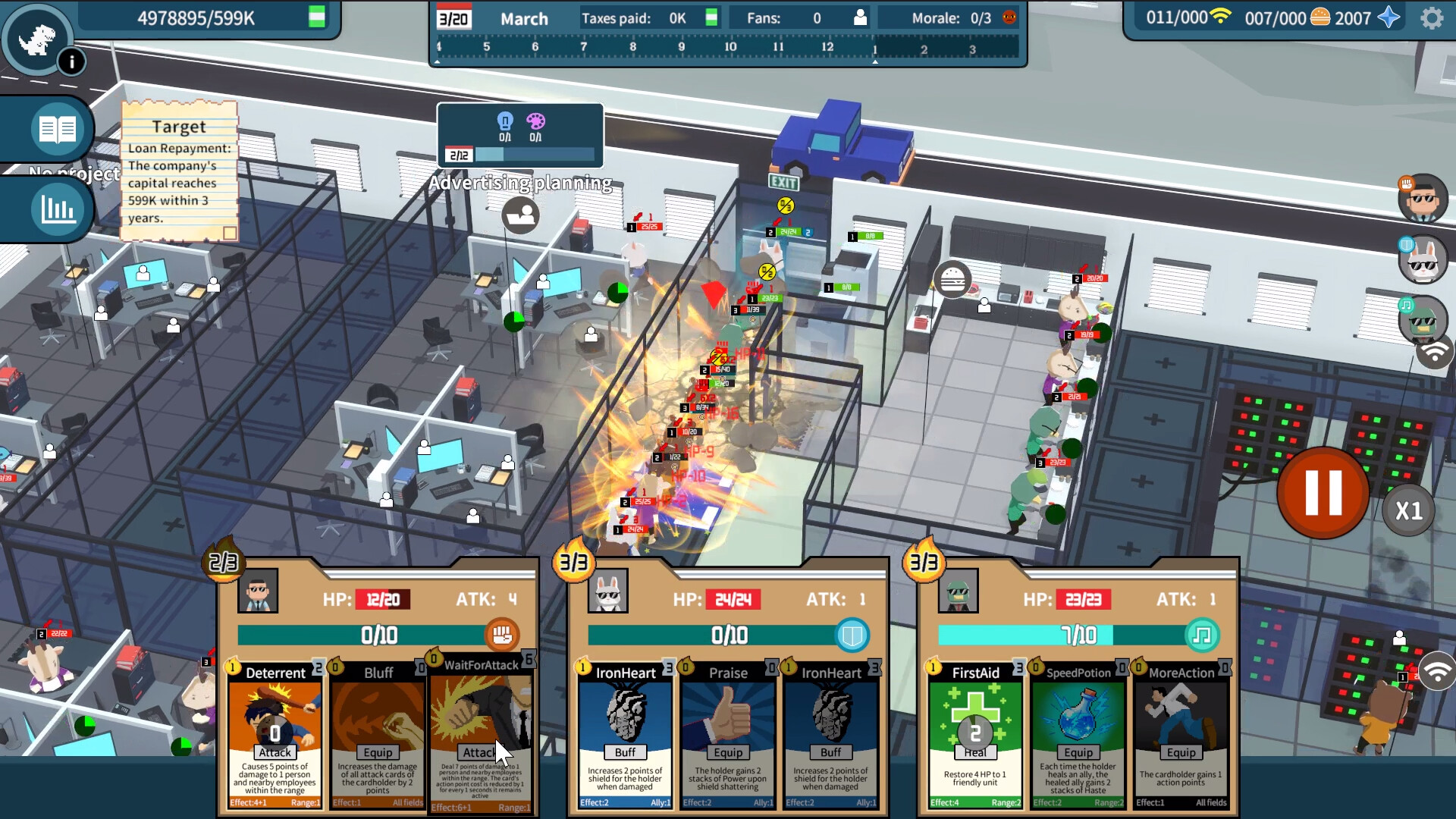 During the year-long work phase, you can activate skill cards on the boss and management staff to automatically attack employees who are exhausted and trying to escape, forcing them to return to their workstations and continue working overtime. Using skill cards consumes action points. Each action point is restored every second.
