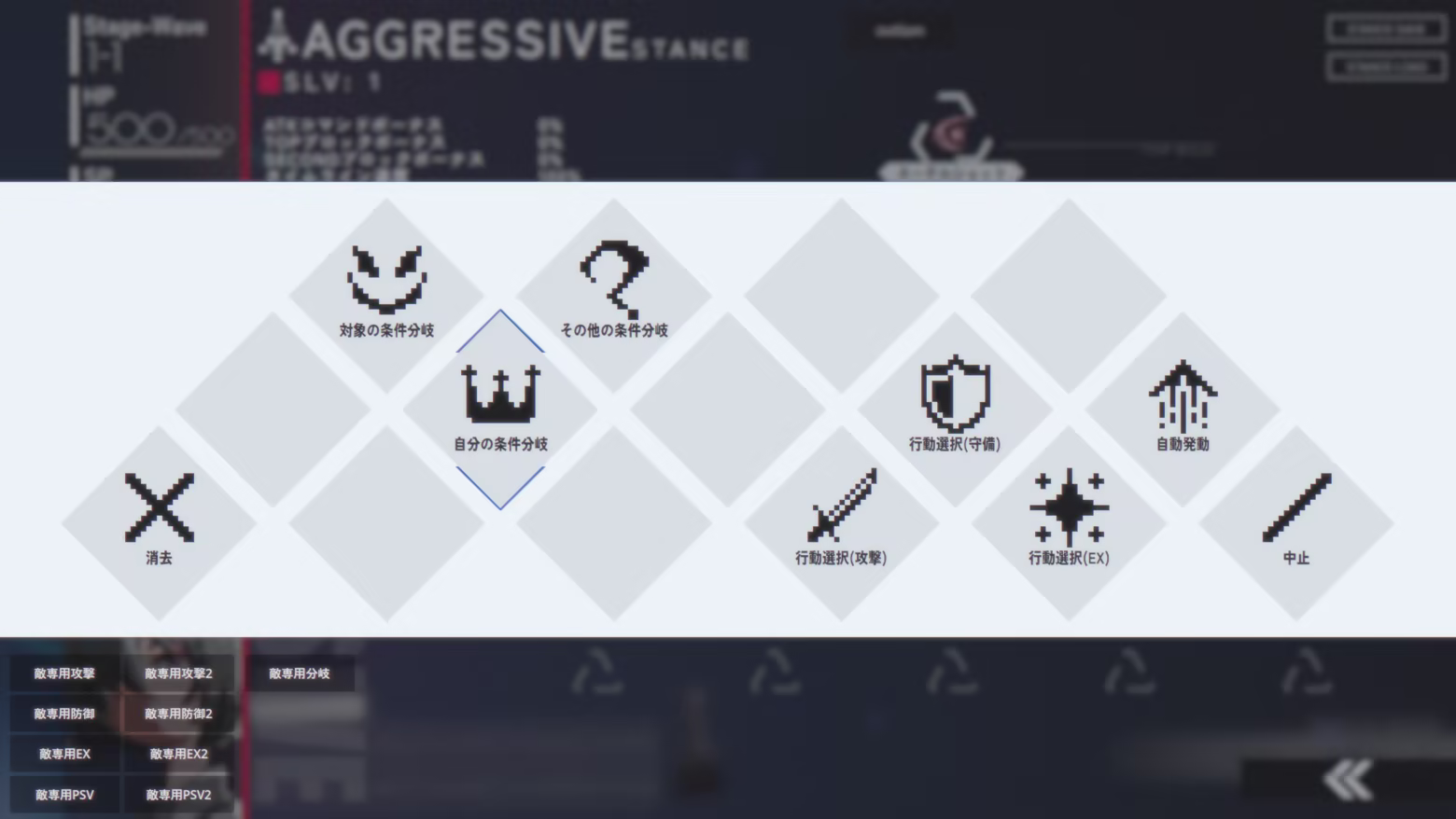 戦術構築では敵の行動や行動開始までの時間、敵と自分の体力やSPの状況、またはランダムなど様々な条件付けができ、