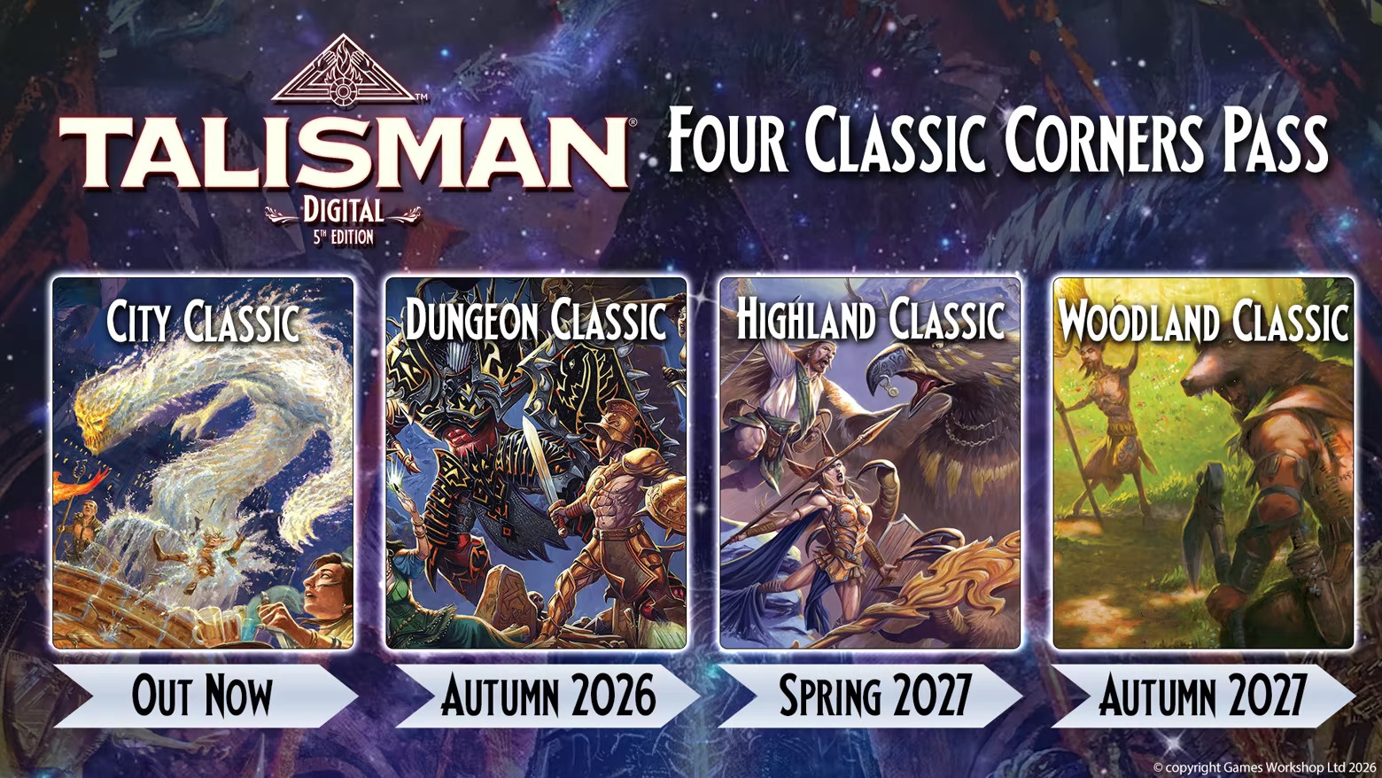 Take your Talisman: Digital 5th Edition experience to the next level with The Four Classic Corners Pass. This pass bundles together four of the most beloved and highly-rated expansions from the 4th Edition era, fully remastered from the ground up for the 5th Edition ruleset.