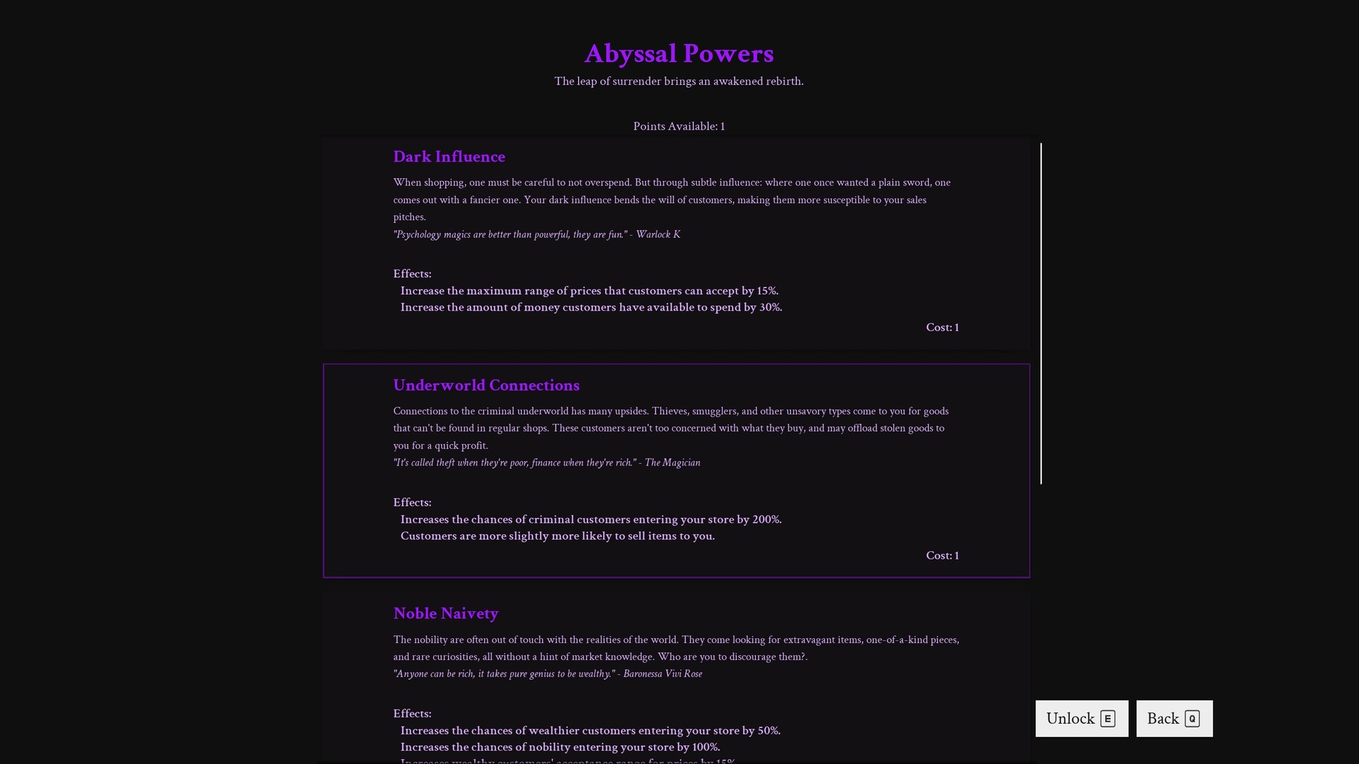 When the economy fails, there’s always divine intervention. Beseech ancient entities for sharper haggling, hypnotic auras, or a well-timed crop failure, since when has profit cared about morals?