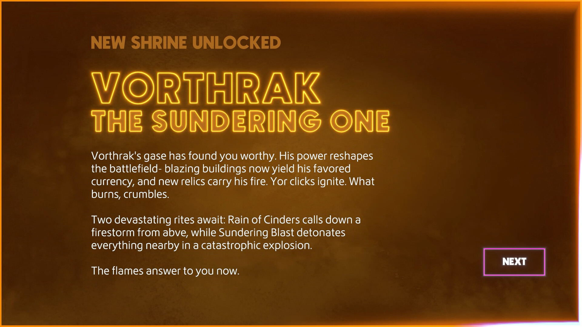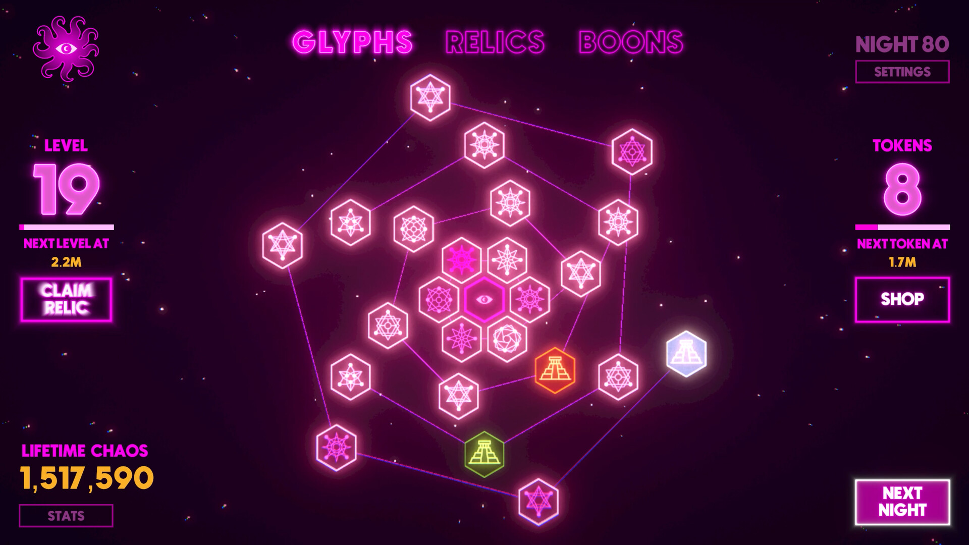 Do what any red-blooded cultist would do. Turn destruction into profit. Spend Tokens in the shop on permanent upgrades, powerful Boons , and special Relics that make each night of devastation more lucrative than the last. Recharge your Relics between runs and watch your power compound like interest on a really evil savings account.