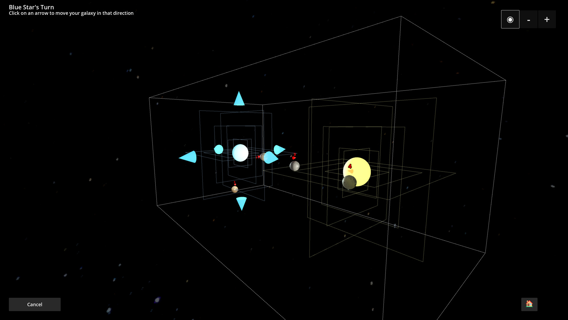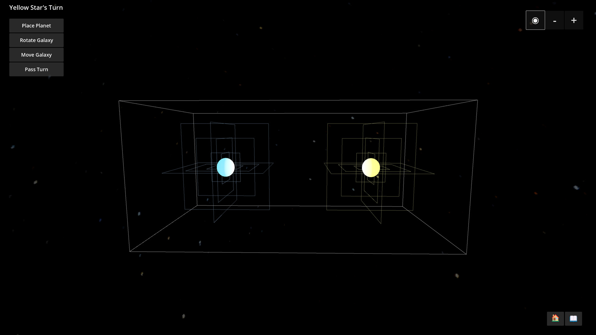 On your turn you can: place a new planet (choose orbit position, direction, and step count), rotate your galaxy (X, Y, or Z), move your galaxy (translate it in space) or pass.