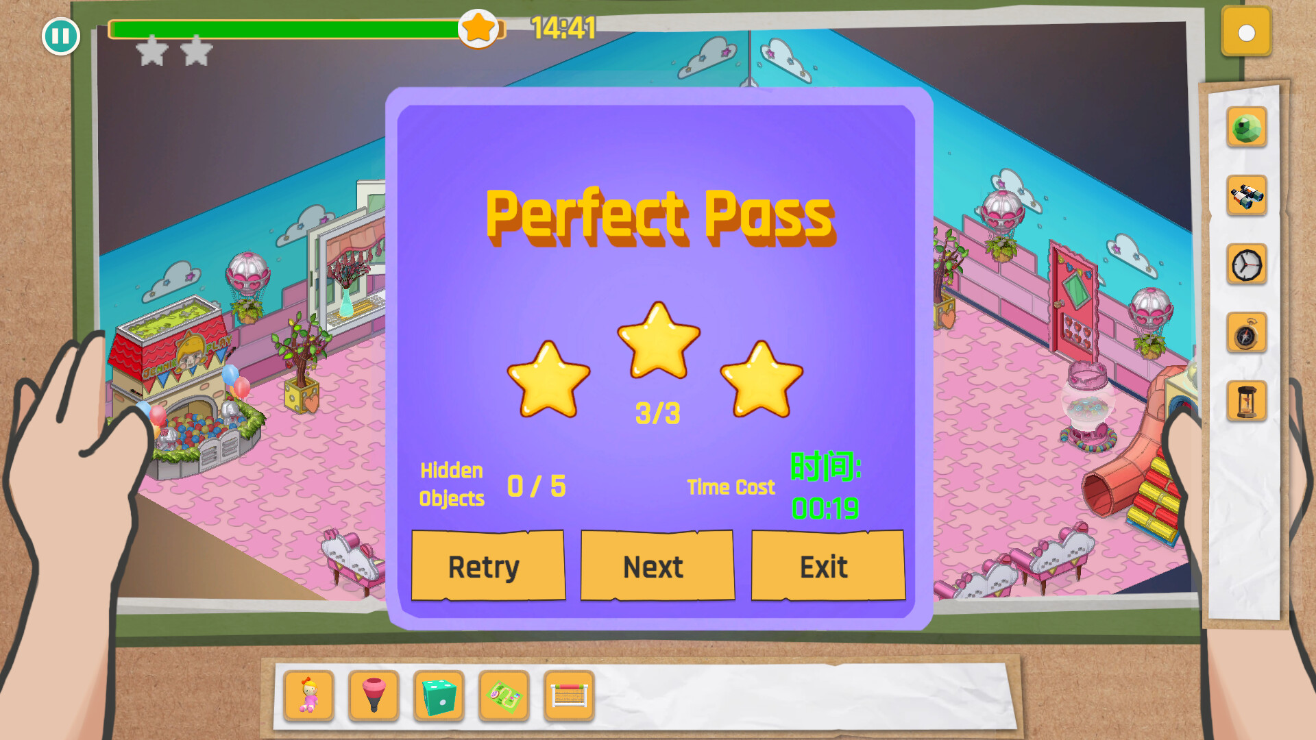Without complex道具, you return to the pure joy of seek‑and‑find games. Rely on your keen observation and logical reasoning to locate target items within intricately detailed scenes. Each level is meticulously designed so that hidden objects—in terms of position, size, and color—blend seamlessly with the environment, challenging your visual acuity.