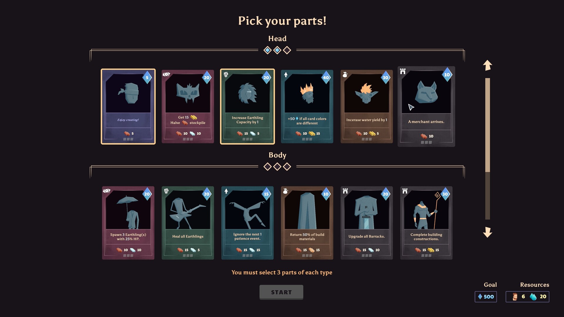 As you progress, you'll build settlements in more challenging biomes. Don't worry if you can't complete them on the first try - that's part of the fun! You'll permanently unlock new part cards with better bonuses, upgrade existing cards, and gain access to new buildings and in-level upgrade options. Return to previous challenges stronger than before, while dynamic biomes and events keep each playthrough fresh.