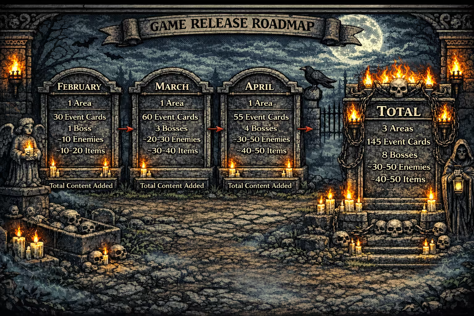 Each update will aim to add more content to the game pushing it to have deeper story and gameplay elements such as build designs and branching story paths. (Event Cards, Items, Skills, Characters, Enemies, etc.)Community Input