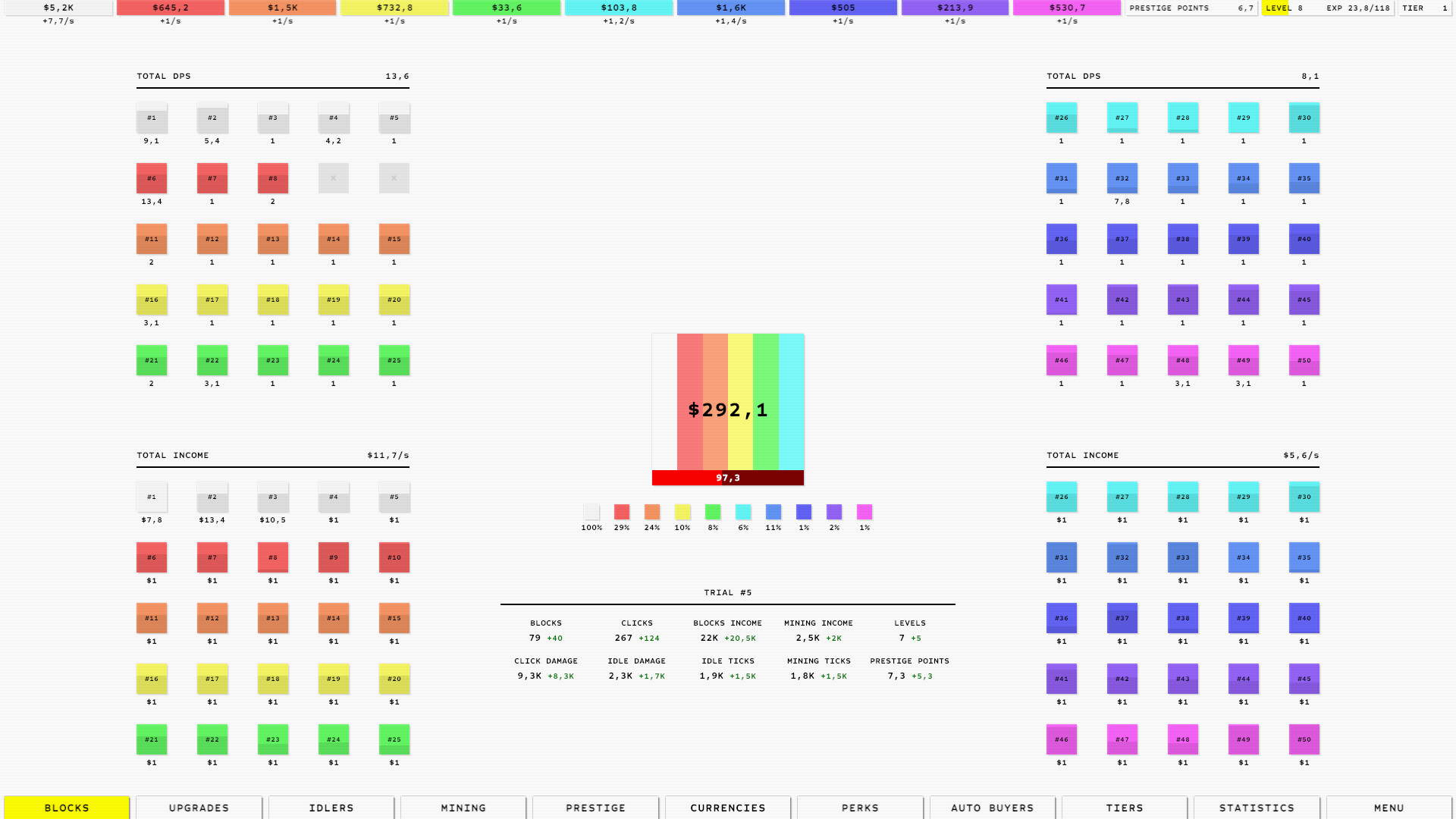 IDLE INCOME is a complex idle clicker game with vast gameplay possibilities. Destroy infinite blocks to earn ten unique currencies. Level up to gain prestige points. Invest in clicks, idle damage, or even passive income. Use the prestige system to boost your stats and generate more profit.