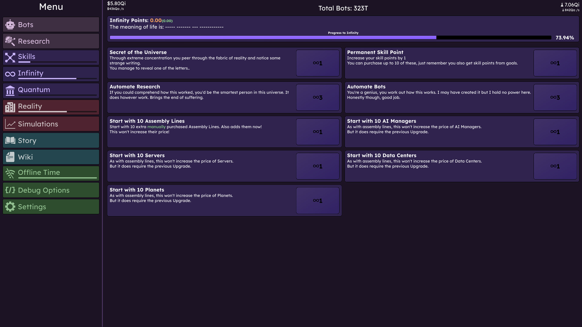 Quantum Leap — Convert Infinity Points into Quantum Points. Unlock automation features, bot multitasking, mega-structure access, and powerful meta-upgrades that fundamentally change how you play.