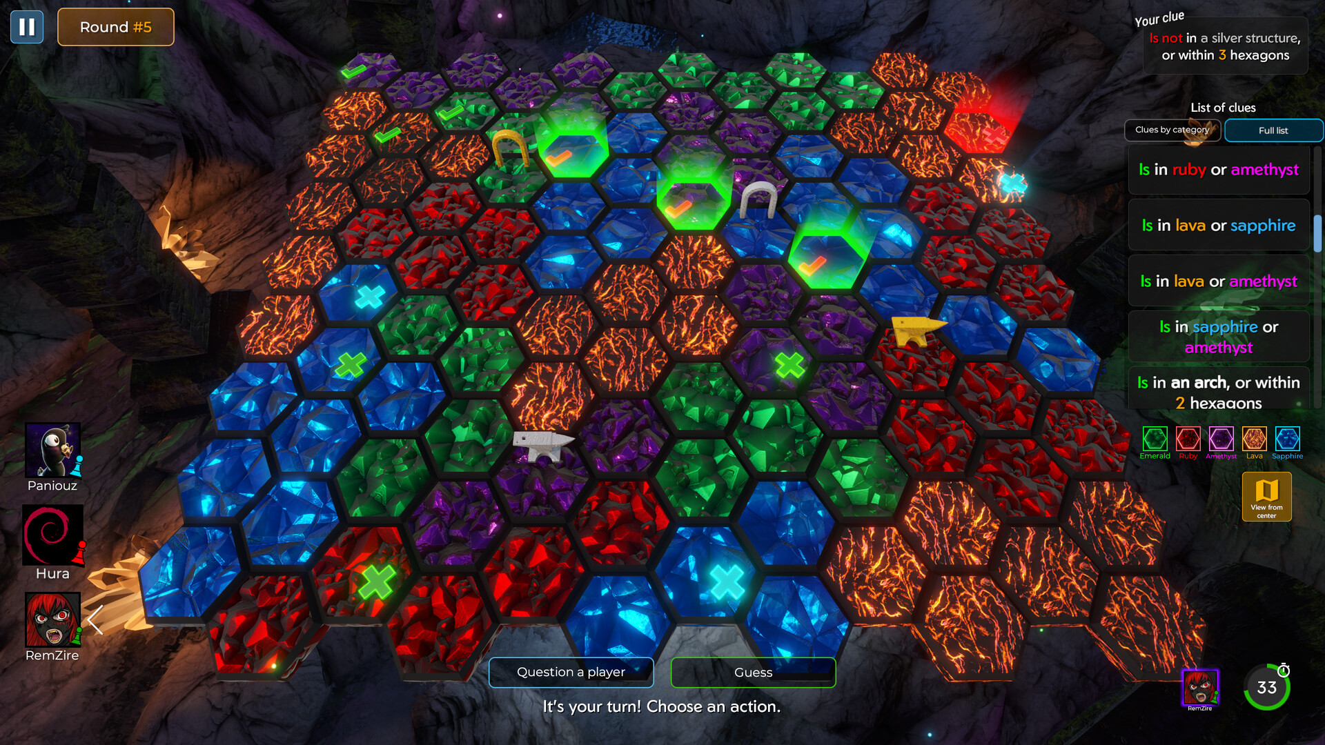To deduce the other players' clues, you must take turns asking a question to the person of your choice. The player answering must state in front of everyone the possibility of being on the requested tile according to their clue.