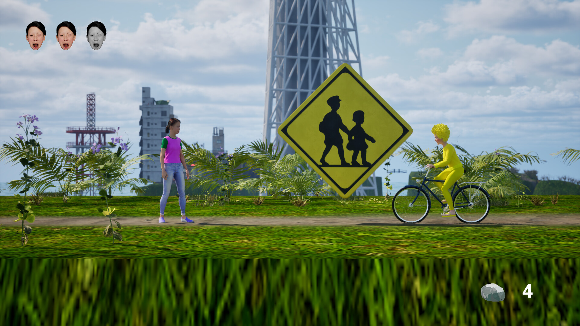 Crouch, jump, and sometimes throw stones to survive the bad luck and reach the goal: your relative's house!
