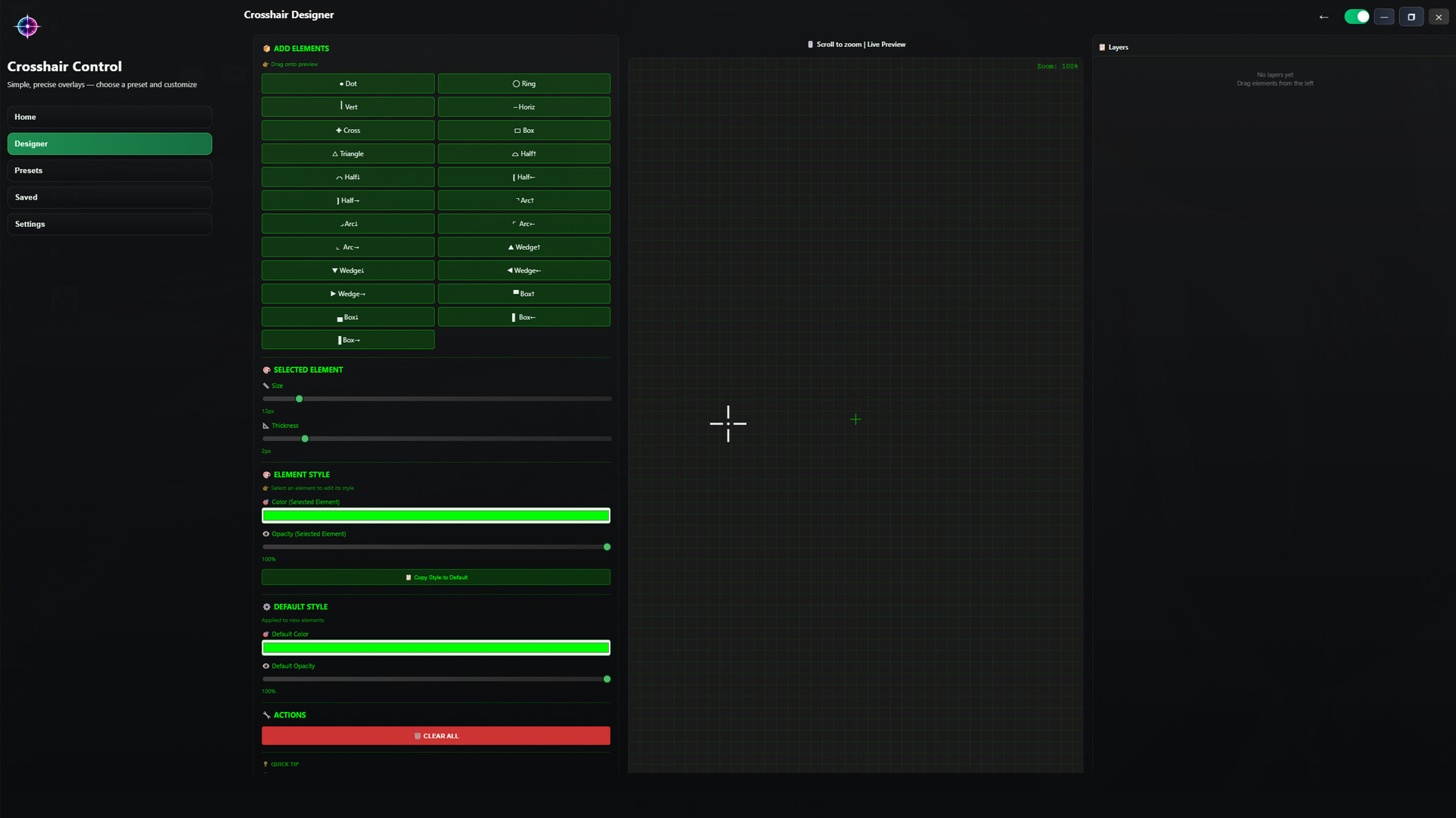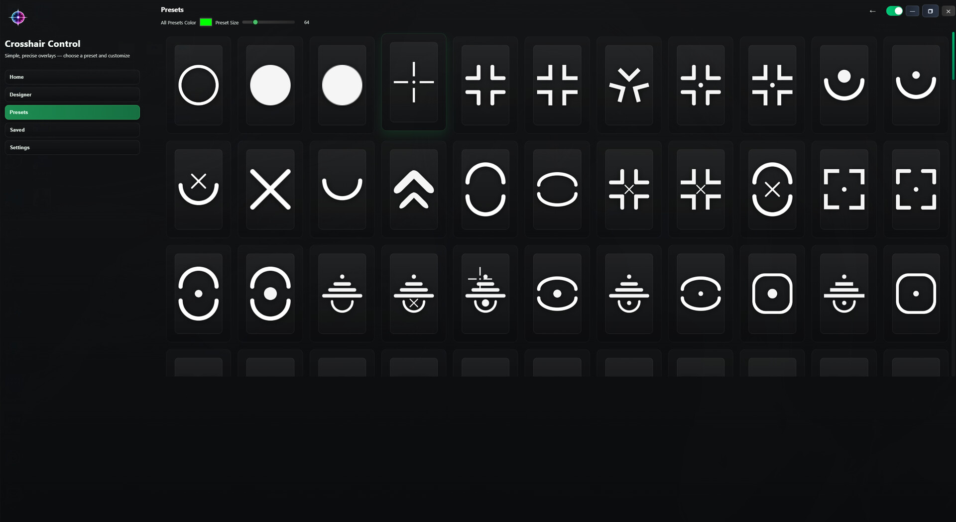 Built for speed and simplicity, Crosshair Control lets you quickly swap styles, save your favorites, and calibrate placement so your crosshair stays consistent across games.