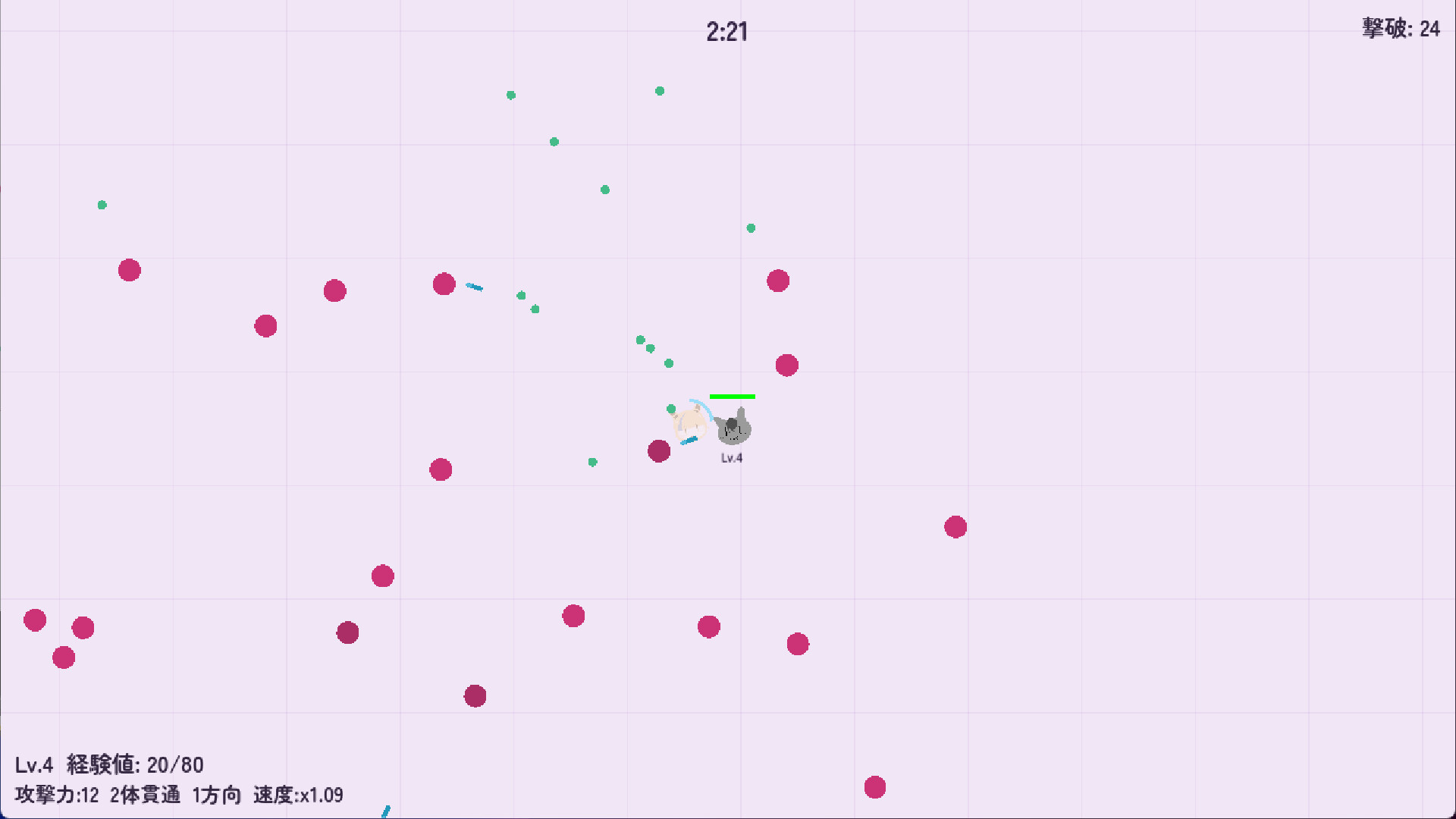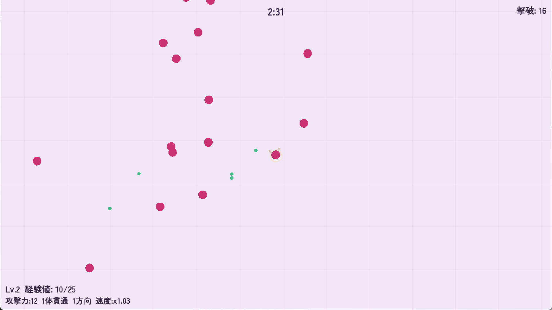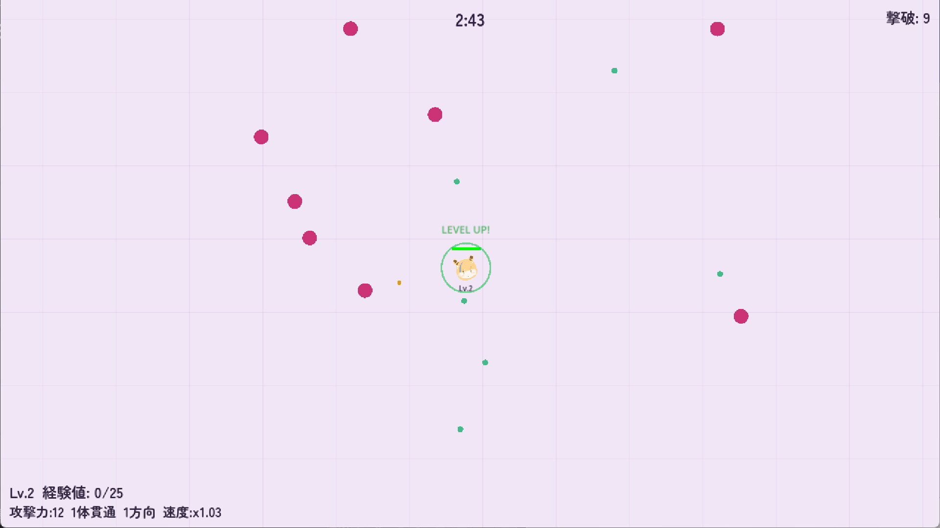 Level Up System — Defeat enemies and collect EXP gems. Each level up enhances your bullets: