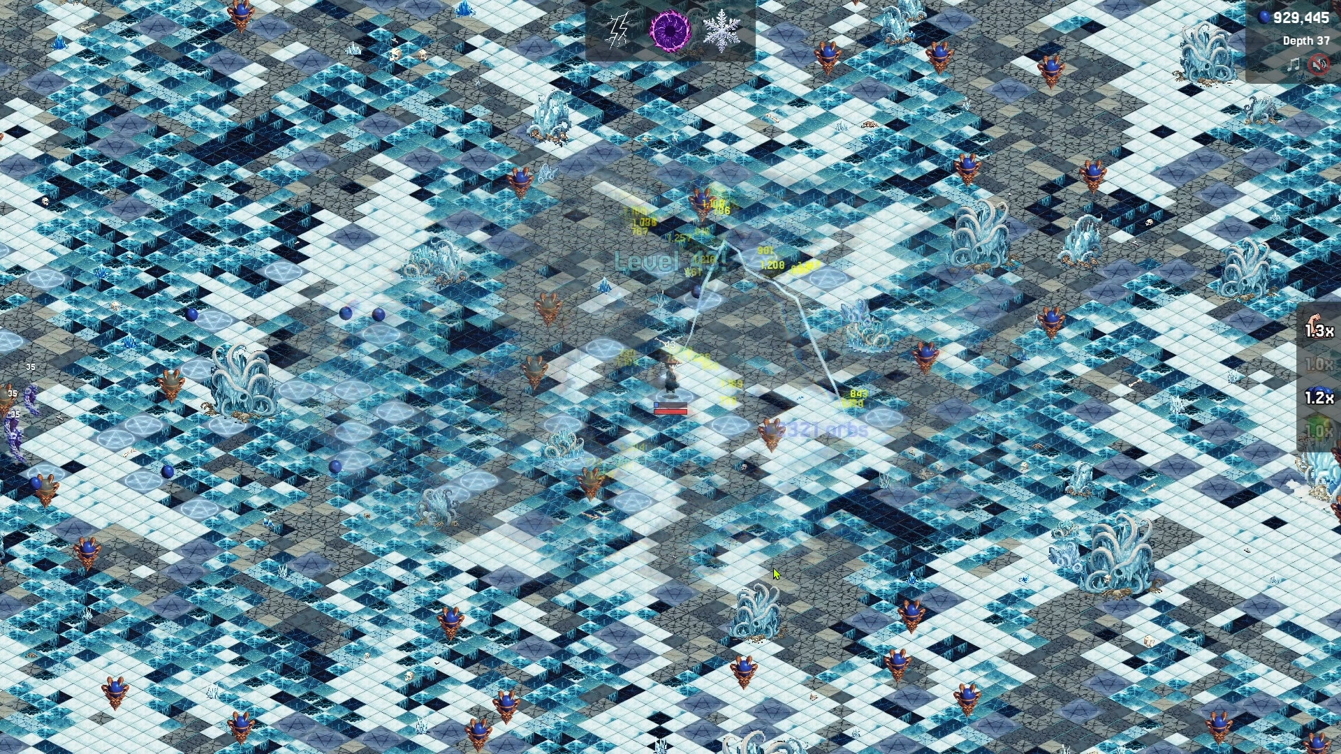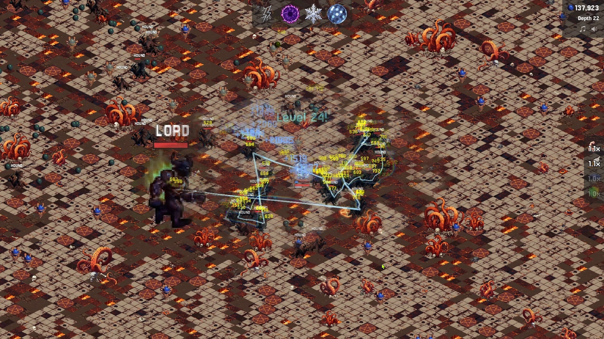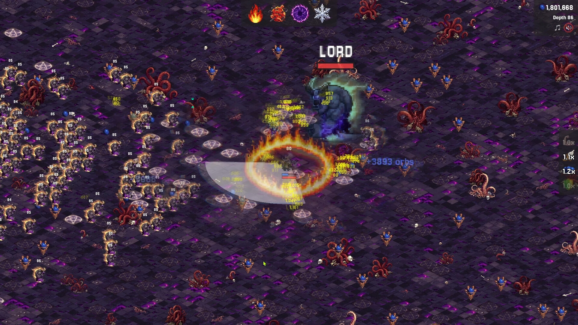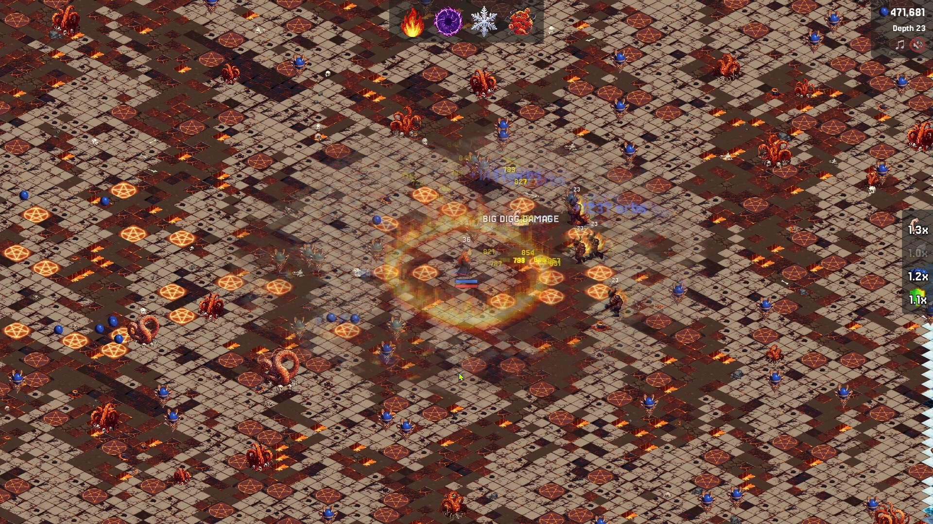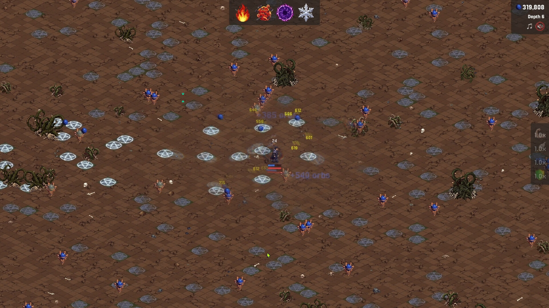 Fight through five increasingly unhinged biomes — Earth, Fire, Ice, Hell, and Beyond. Hunt down fleeing treasure hellhounds for fat orb payouts, snatch temporary stacking power-ups that turn you into a walking war crime for 30 seconds, and watch crits, bleed, and ignite absolutely cook entire screens.