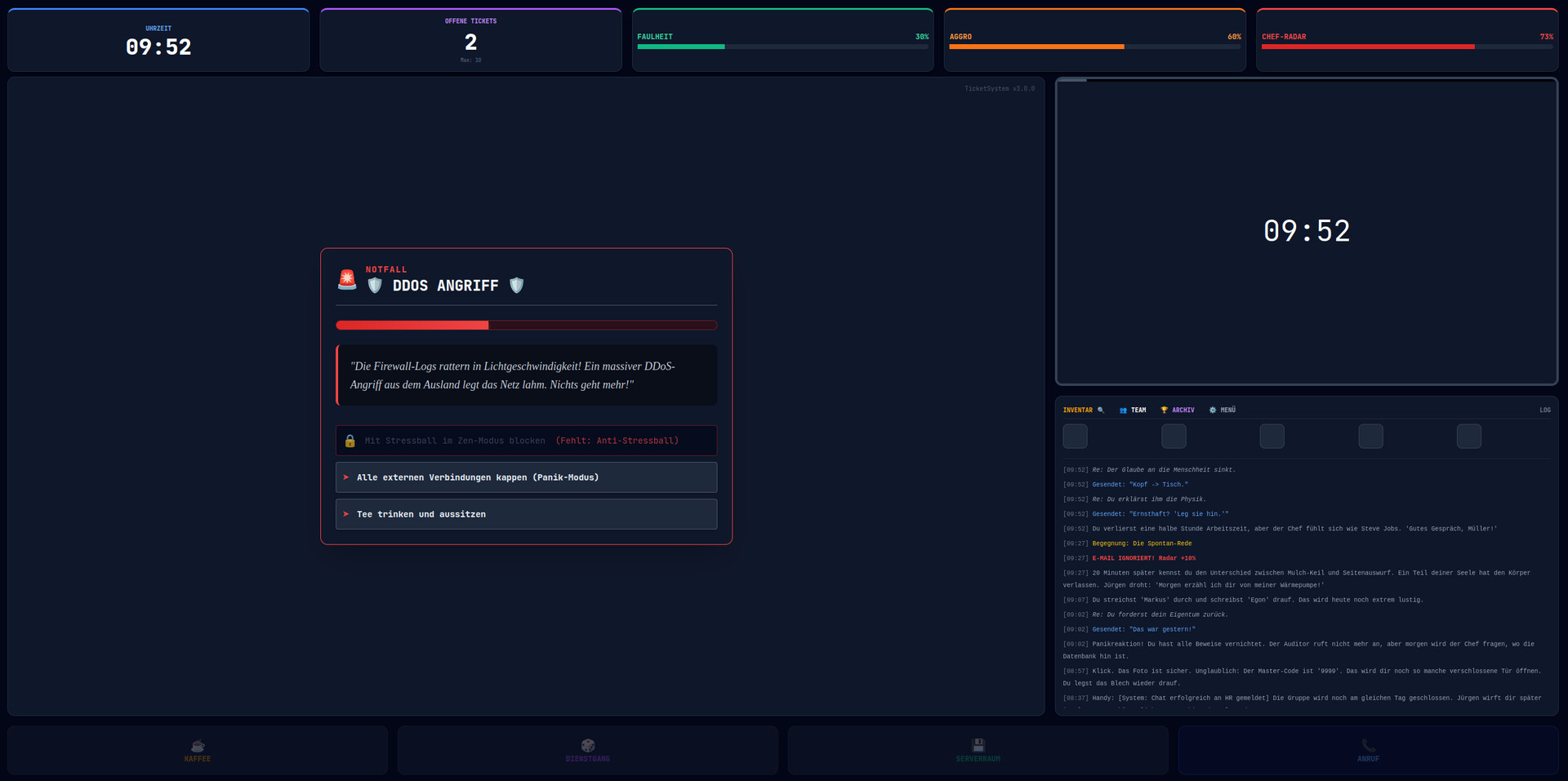 Wie spielt es sich? Das Spiel ist ein satirisches, textbasiertes Entscheidungsspiel mit Ressourcen-Management. Jede E-Mail, jeder Anruf und jeder Gang zur Kaffeemaschine zwingt dich zu Entscheidungen. Gehst du professionell vor oder wählst du den Weg der maximalen Faulheit? Jede deiner Antworten beeinflusst deine drei wichtigsten Überlebens-Werte: