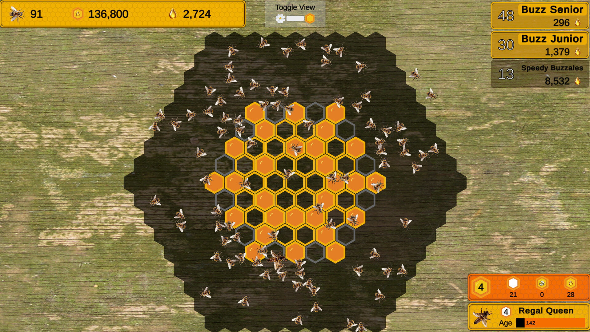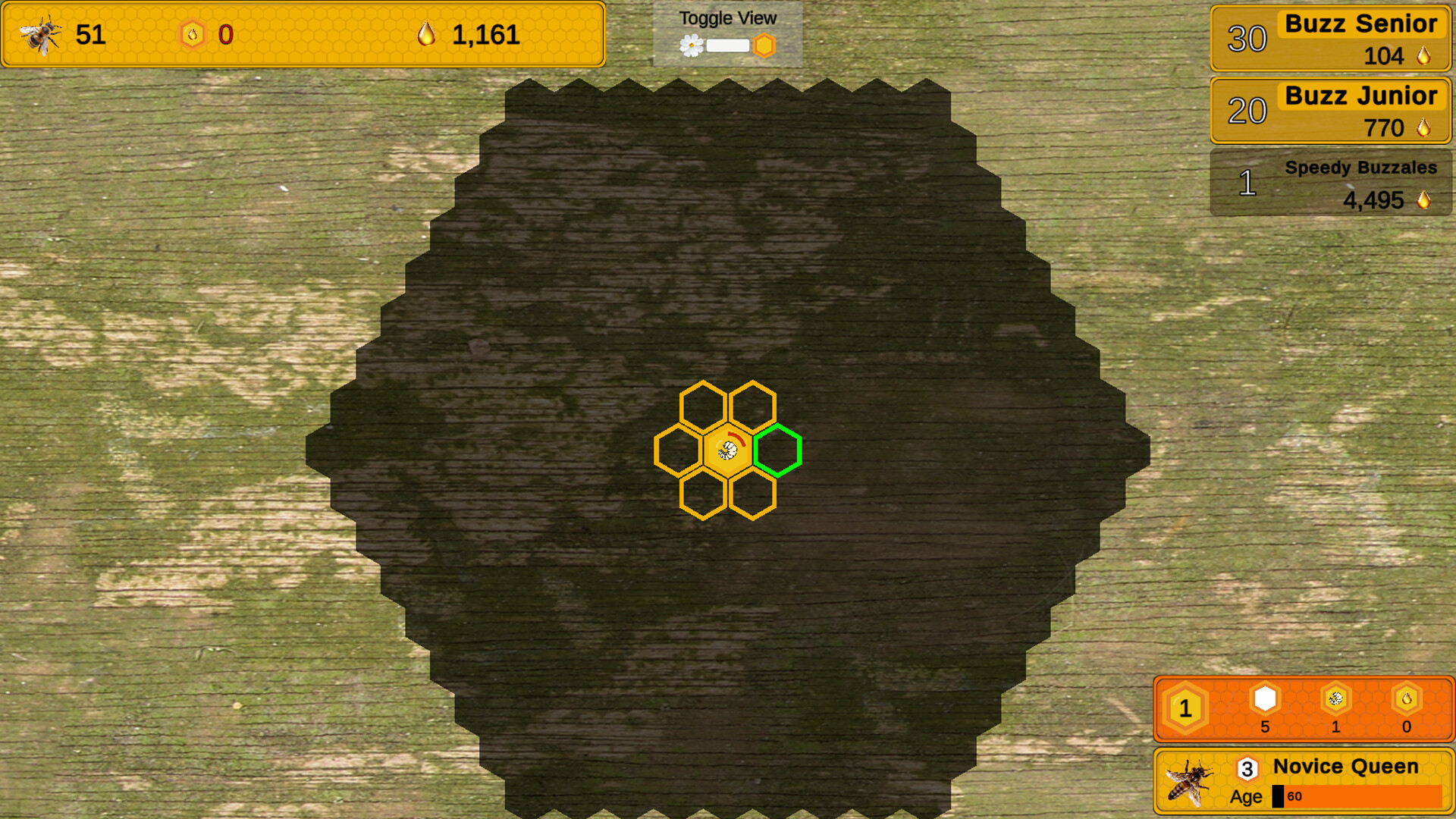 Once you have an open cell in your honeycomb, you can then spend more honey on hatching new bees to collect more honey. More experienced and efficient bees can be hatched, once you've purchased enough bees of the previous level.