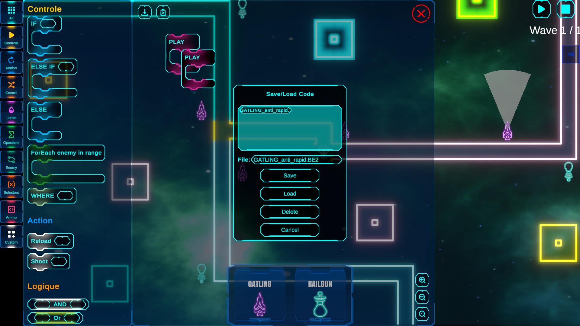 Each turret has its own code editor. Open it, drag blocks in, and define behavior:- Shoot nearest: a one-block program that works.