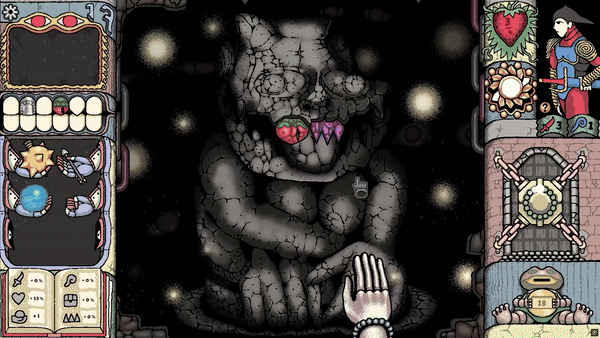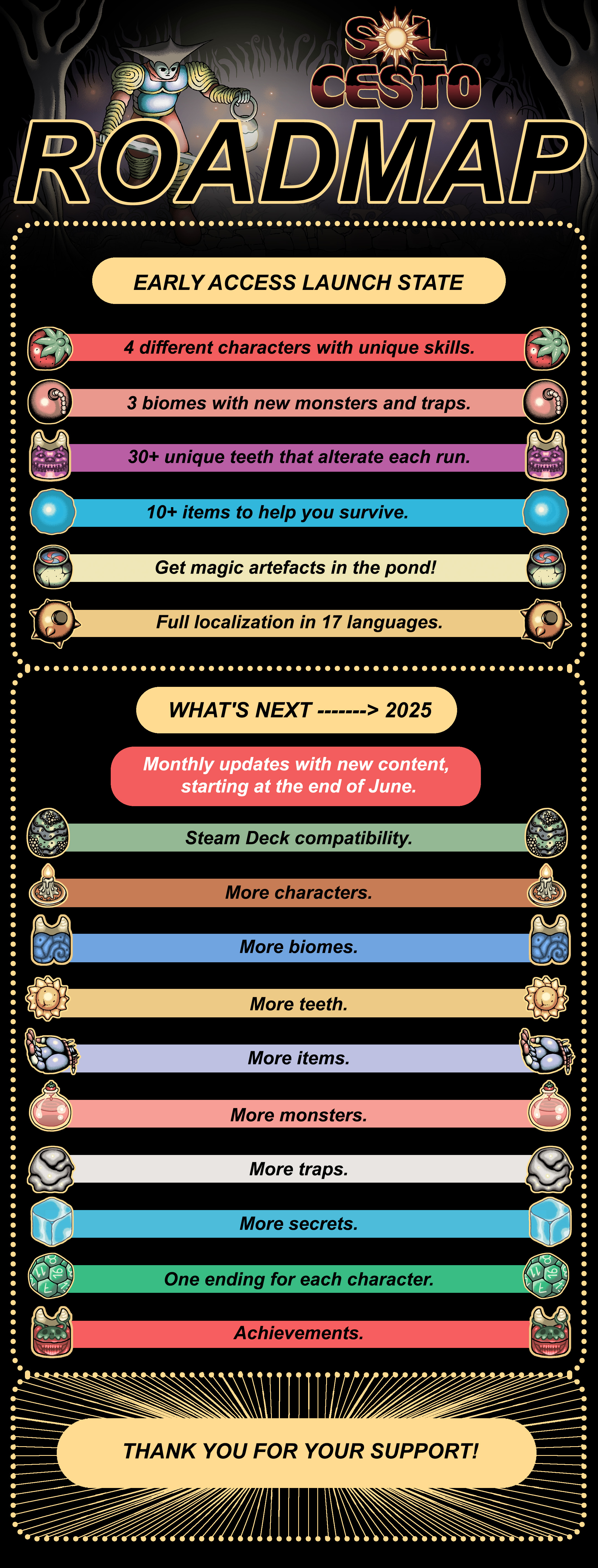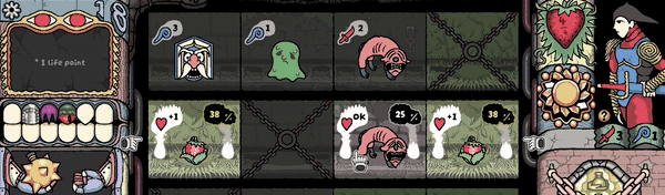 In Sol Cesto, your goal is to descend through the levels of a randomly generated underground world, diving ever deeper in search of the sun, lost for countless years. On the combat grid, choose one of four rows to move into. You'll then land randomly on one of the four tiles in that row: will it be a monster that harms you? A chest full of gold? Or perhaps a deadly poison trap? Anything can happen…