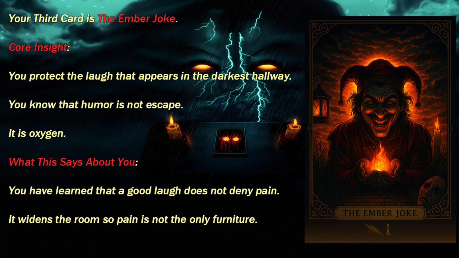 Personality Test Psychology meets Dark Tarot in this wonderful amalgamation of questions, answers, and choices. Enjoy a fully-narrated experience alongside a splendid musical score that will have you simultaneously relaxed and on edge from start to finish.