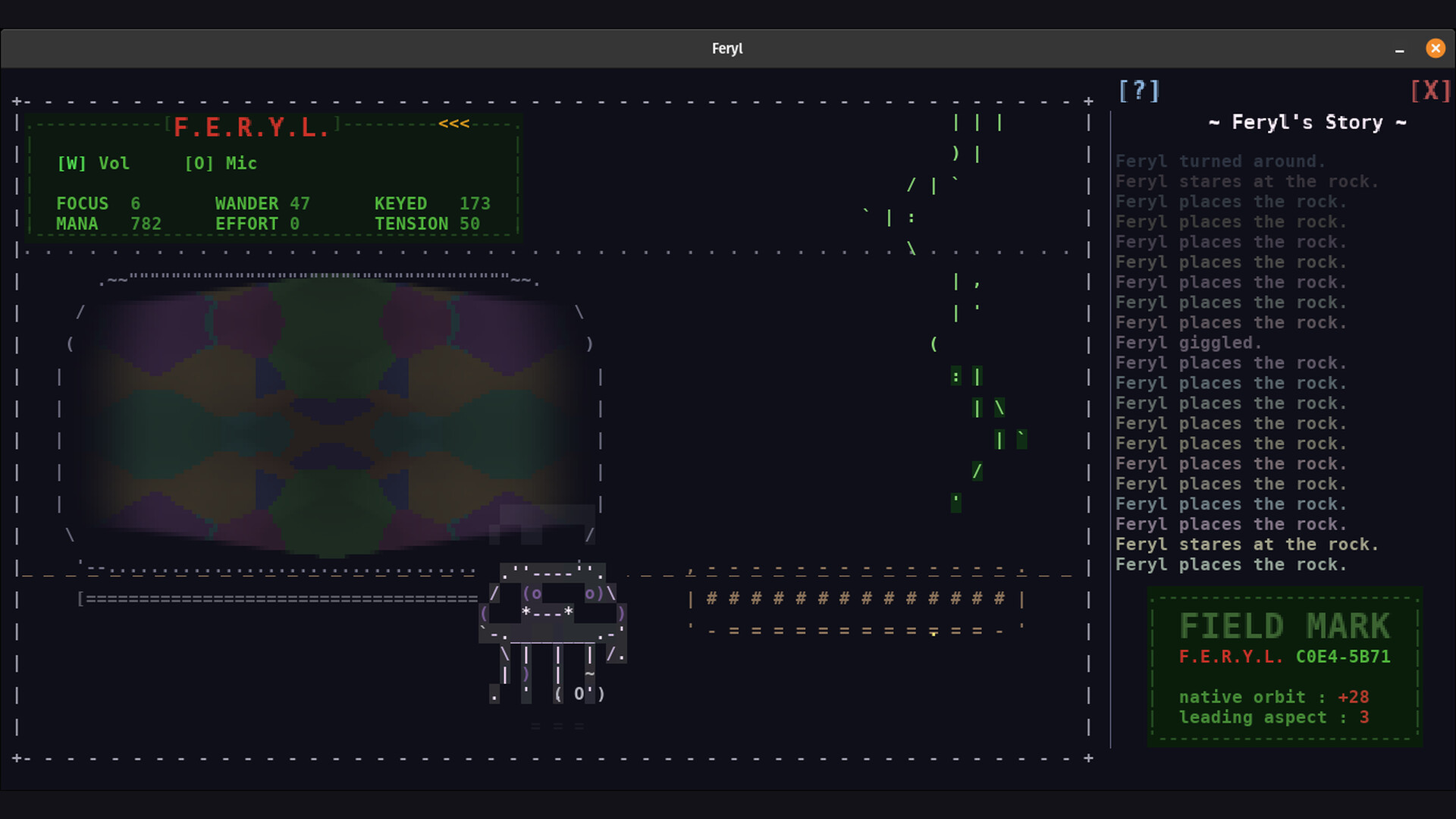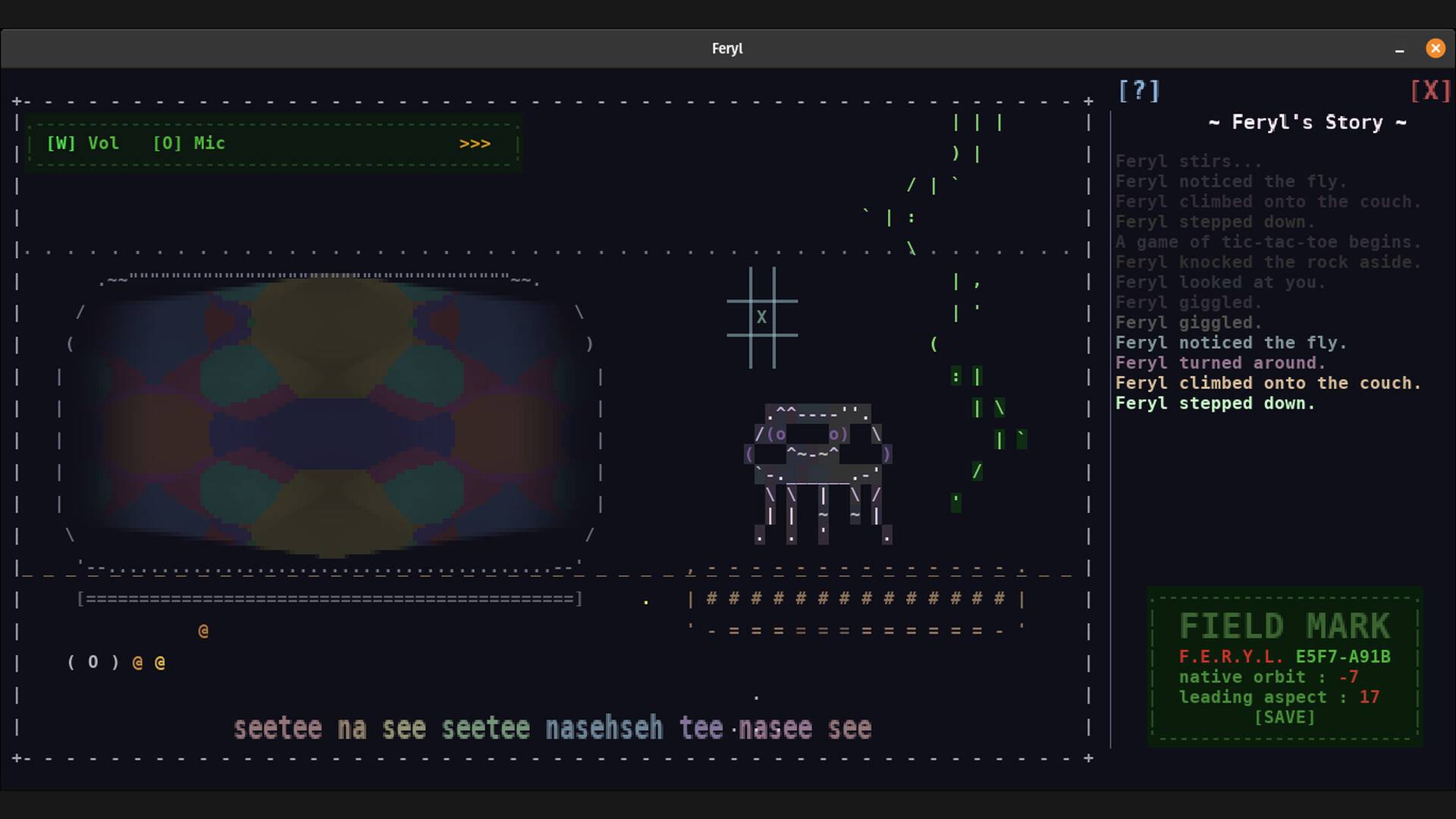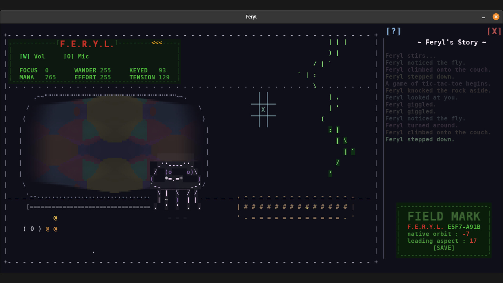 Click the board to start a match. If Feryl becomes interested, it may approach the board and make its move. If you can keep its attention, you may even complete a full game.